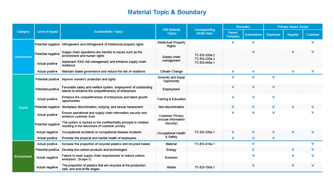 In 2024, the company identified a total of 17 sustainability topics, including 12 aligned with GRI standards and 1 self-defined topic. Compared to 2023, “Labor-Management Relations” was added as a new topic in 2024. Following the PDCA (Plan-Do-Check-Act) management cycle, Getac proposed response strategies for each topic—not only to mitigate negative impacts but also to proactively enhance the potential positive impacts.